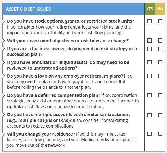 Entering retirement with significant debt in car loans, credit cards, parent plus loans, 401k loans or second mortgages can put unnecessary pressure on your assets. Any debt you carry into retirement needs to be factored into cash flow. Whether you are a Dave Ramsey debt snowball fan, or the debt avalanche method (see this link from Investopedia), debt payments need to be in your plan, and likely for as short a time as possible.